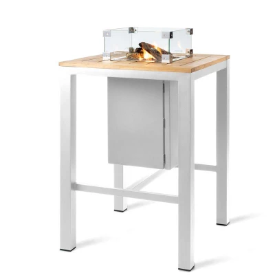 Hvitt barbord laget av aluminiumsramme med teakbordplate. Dette elegante bordet i et moderne deseign passer i mange forskjellige hager og terrasser. I bordet er det en innebygd gassbrenner, som skaper en hyggelig atmosfære og varme som kan nytes uten røyk og gnist. Flammenes høyde kan kontrolleres ved hjelp av en kontrollknapp. Nyt flammen og varmen uten røyk og gnist.