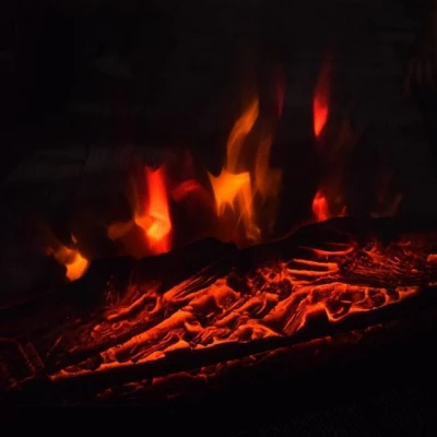 Flammene på innsatsen reflekterer vakkert på den svarte bakveggen, spesielt i mørket kommer den vakre peisen til sin rett.
