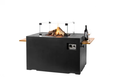 Rektangulær utendørs gasspeis i kompositt. Gasspeisen fungerer som et bord, men du kan også kjøpe sidebord som kan settes på, slik at du kan få drikke eller annet lenger borte fra varmen. Peisens høyde gjør at gassflasken kan skjules under bordet. Cocoon Table Lounge & Dining gir en koselig atmosfære med realistiske flammer.