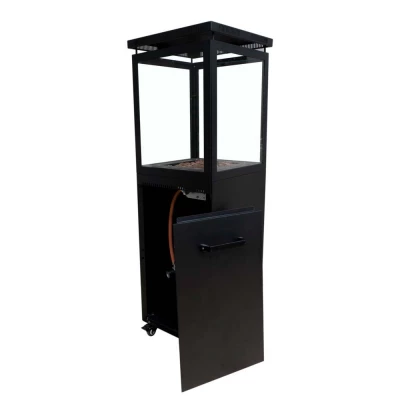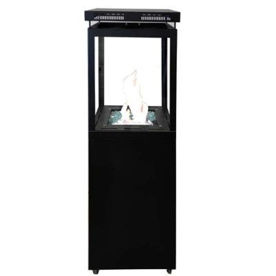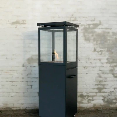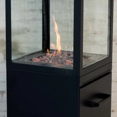 Svart frittstående gasspeis, som er ideell for å skape en koselig atmosfære på terrassen, balkongen eller i hagen. Peisen er designet i stål og med 4 glassider, som gjør det mulig å se de vakre flammene fra alle kanter.